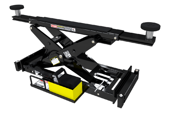 You don't need a two-post lift to perform wheel service at a comfortable height. Turn your four-post lift into an on-the-car wheel service dynamo with a BendPak Bridge Jack. These scissor-style jacks offer peerless speed and versatility, so you can easily raise two or four wheels off the runways for brake jobs and suspension work. The exclusive telescoping chassis design accommodates BendPak four-post lifts with adjustable-width runways, precision sliders and rollers, enabling you to position the hydraulic jack exactly where you need it. These air / hydraulic four-post bridge jacks come complete with three safety locking positions and stackable pad adapters for multi-vehicle versatility.